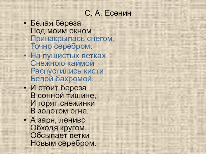 С. А. ЕсенинБелая береза  Под моим окном  Принакрылась снегом,  Точно серебром.На пушистых ветках