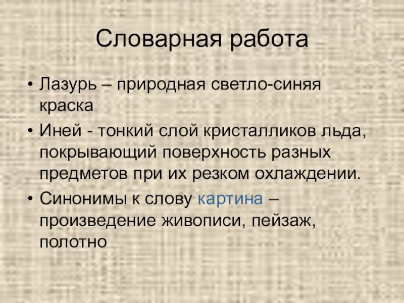 Словарная работаЛазурь – природная светло-синяя краскаИней - тонкий слой кристалликов льда, покрывающий поверхность разных предметов при их