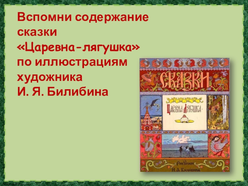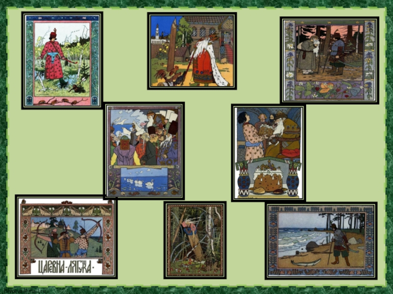 Иван Яковлевич Билибин создал иллюстрации к пушкинским «Сказке о царе Салтане» и «Сказке о золотом петушке». Наиболее известными и самыми удачными являются его иллюстрации к русским народным сказкам «Царевна-лягушка», «Василиса Прекрасная», «Марья Моревна».