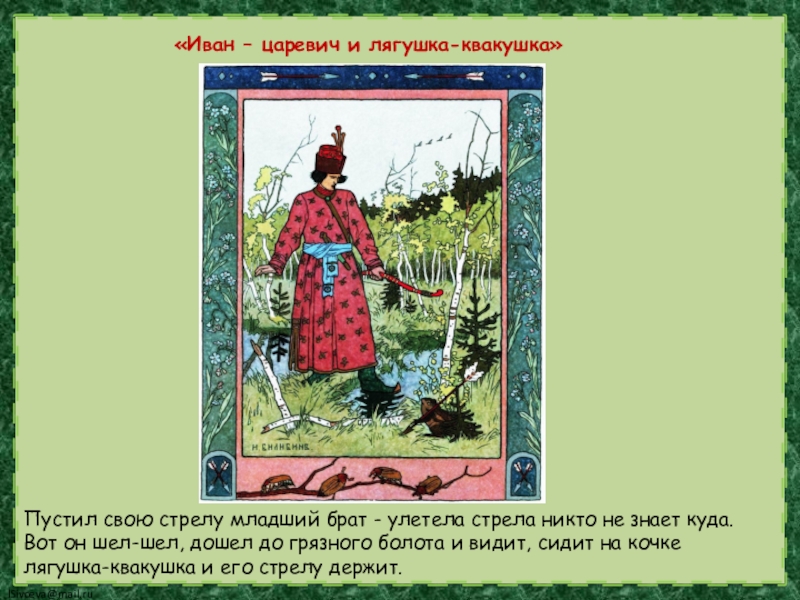 длинный(народный русский) кафтан, подпоясан кушаком, шапка с отворотом, сафьяновые сапоги, держит лук, удивлён, смотрит с грустью, опечален;