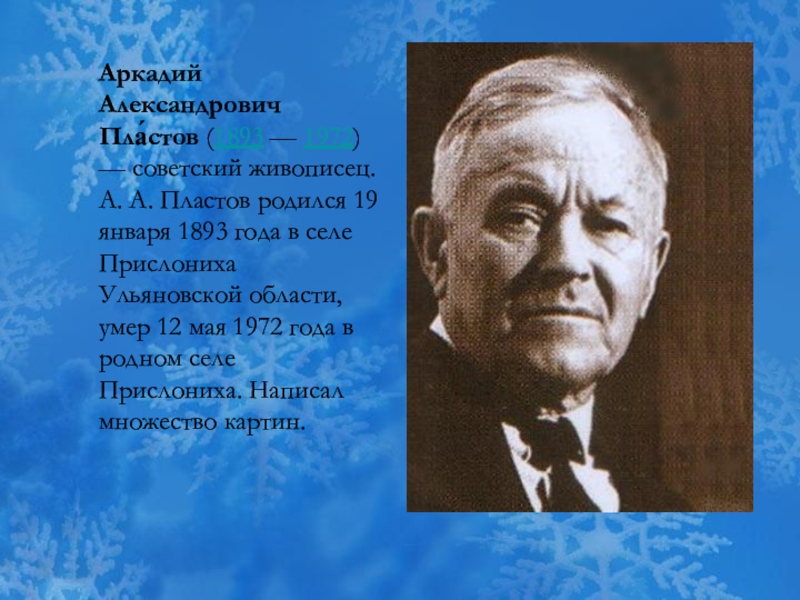 Слайд 2Аркадий Александрович Пла́стов (1893 — 1972) — советский живописец. А. А. Пластов родился 19 января