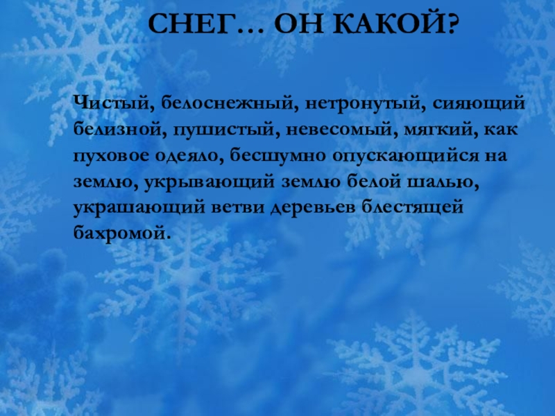 Снег… Он какой?Чистый, белоснежный, нетронутый, сияющий белизной, пушистый, невесомый, мягкий, как пуховое одеяло, бесшумно опускающийся на землю,