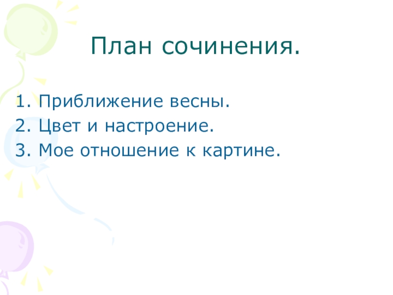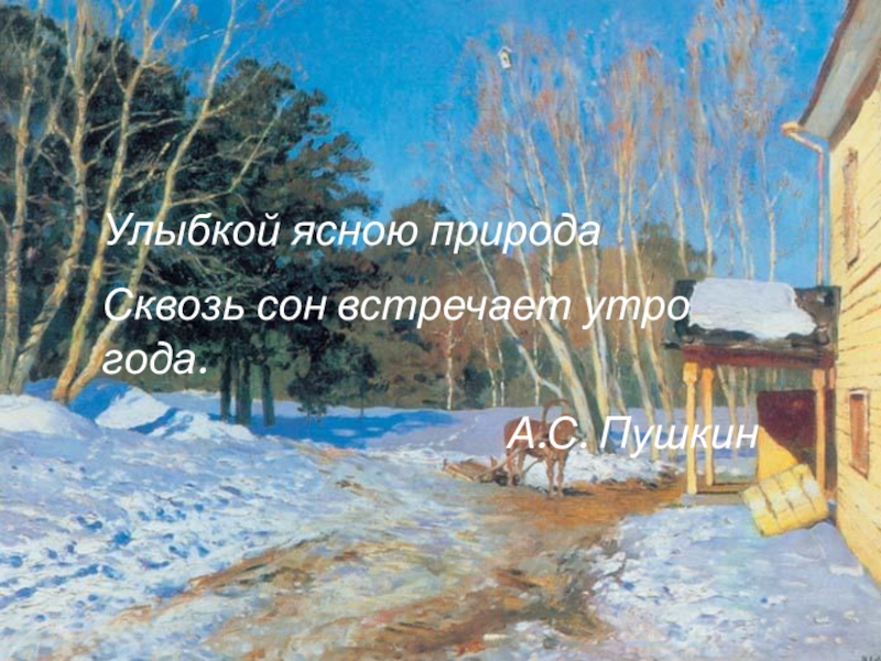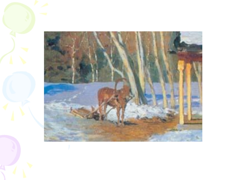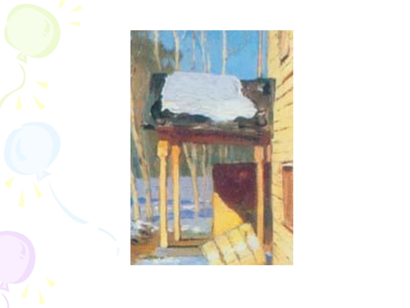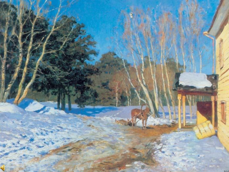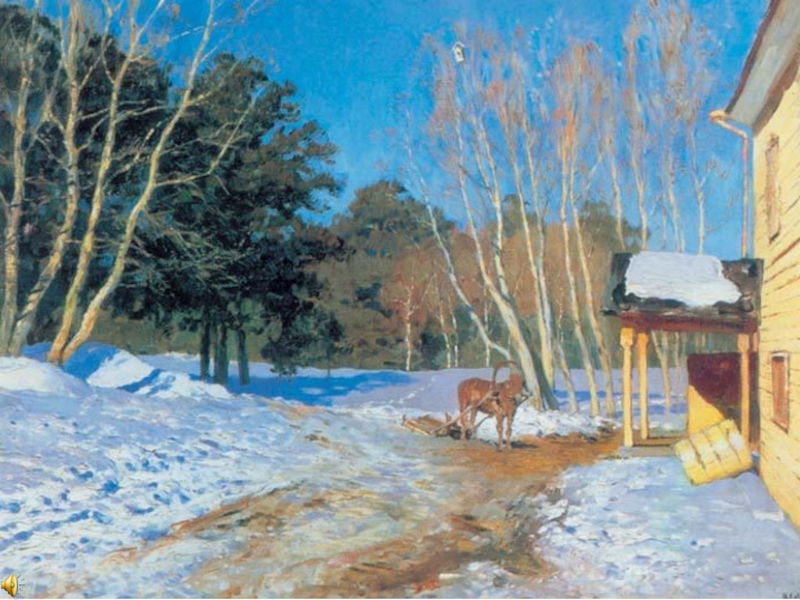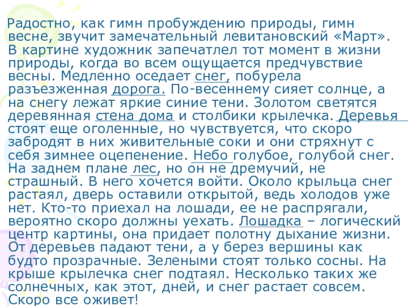 звучит замечательный левитановский «Март». В картине художник запечатлел тот момент в жизни природы, когда во всем ощущается предчувствие весны. Медленно оседает снег, побурела разъезженная дорога. По-весеннему сияет солнце, а на снегу лежат яркие синие тени. Золотом светятся деревянная стена дома и столбики крылечка. Деревья стоят еще оголенные, но чувствуется, что скоро забродят в них живительные соки и они стряхнут с себя зимнее оцепенение. Небо голубое, голубой снег. На заднем плане лес, но он не дремучий, не страшный. В него хочется войти. Около крыльца снег растаял, дверь оставили открытой, ведь холодов уже нет. Кто-то приехал на лошади, ее не распрягали, вероятно скоро должны уехать. Лошадка – логический центр картины, она придает полотну дыхание жизни. От деревьев падают тени, а у берез вершины как будто прозрачные. Зелеными стоят только сосны. На крыше крылечка снег подтаял. Несколько таких же солнечных, как этот, дней, и снег растает совсем. Скоро все оживет!
