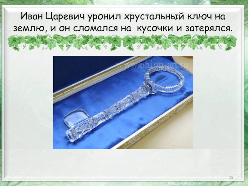 Слайд 18Иван Царевич уронил хрустальный ключ на землю, и он сломался на
