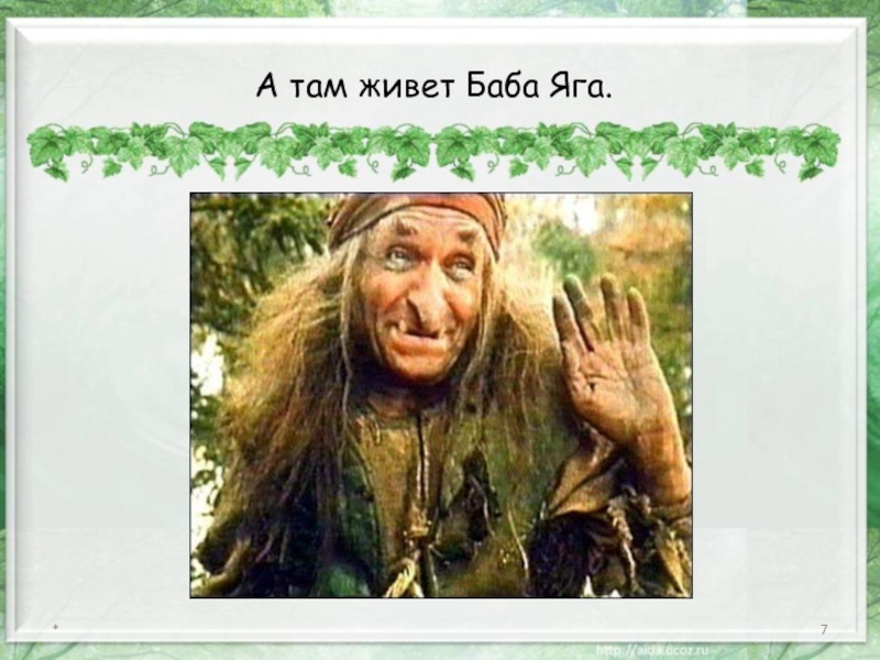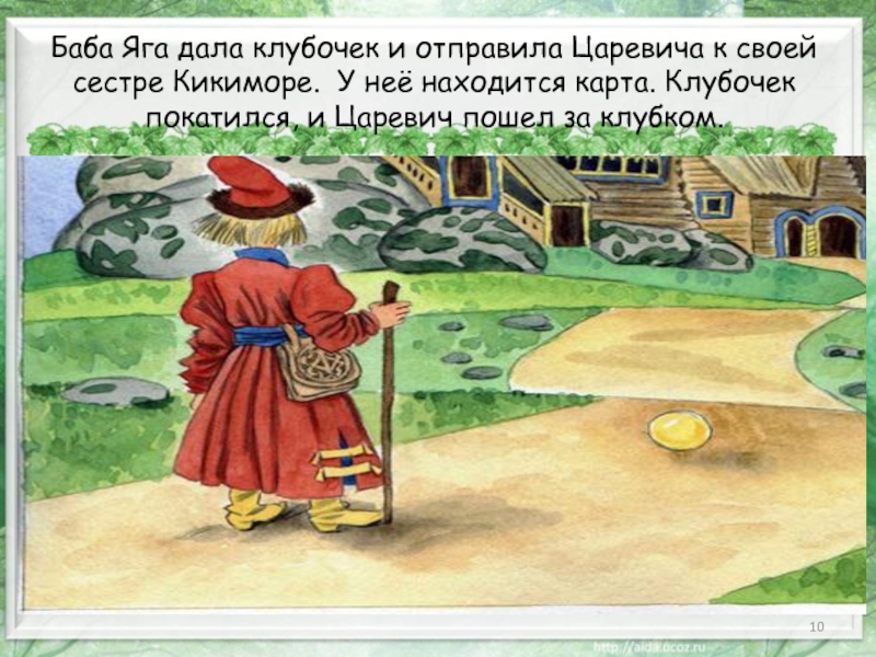 Слайд 10Баба Яга дала клубочек и отправила Царевича к своей сестре Кикиморе.