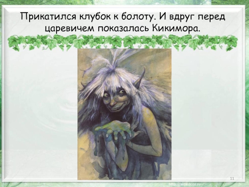 Слайд 11Прикатился клубок к болоту. И вдруг перед царевичем показалась Кикимора.