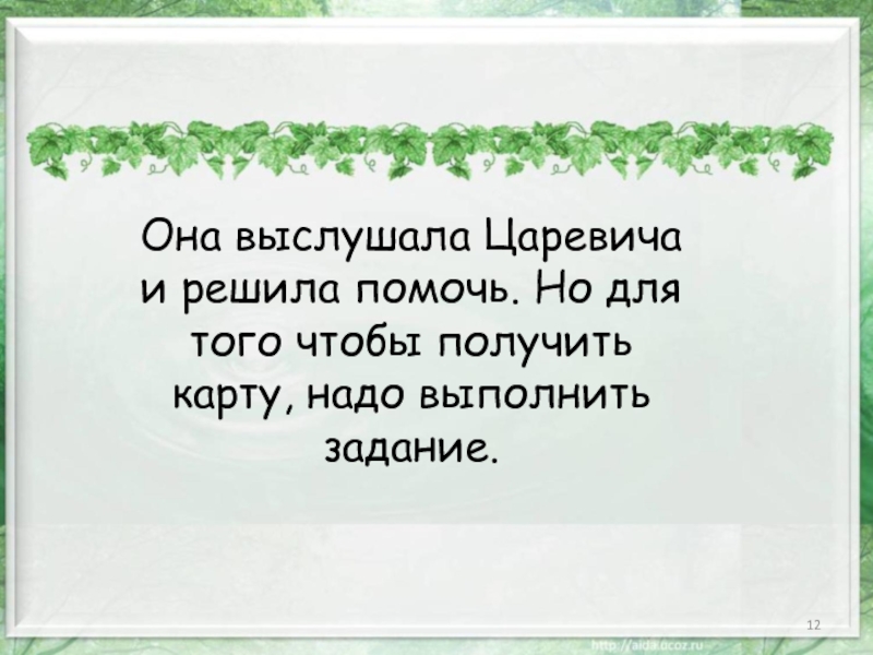 Слайд 12Она выслушала Царевича и решила помочь. Но для того чтобы получить