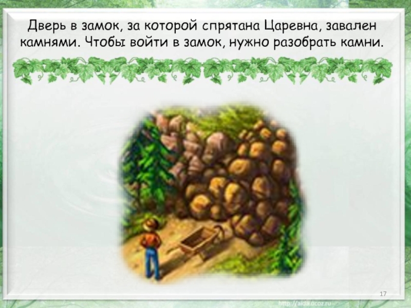 Слайд 17Дверь в замок, за которой спрятана Царевна, завален камнями. Чтобы войти