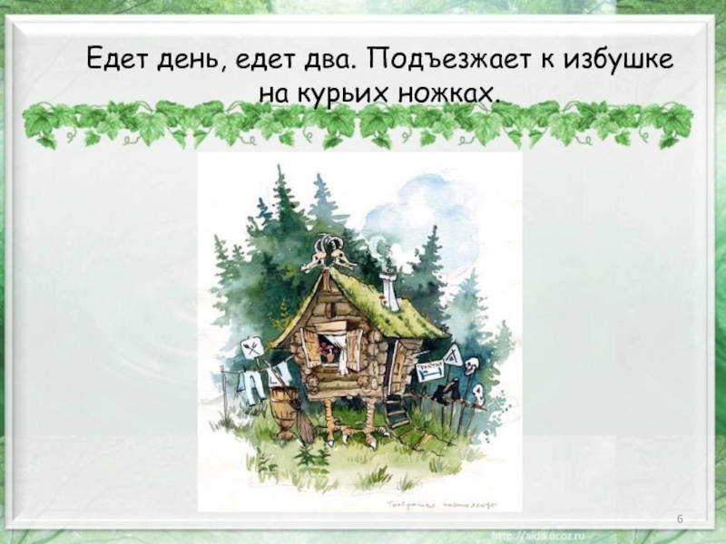 Слайд 6Едет день, едет два. Подъезжает к избушке на курьих ножках.