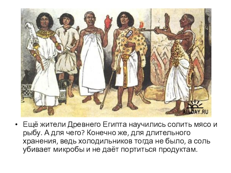 Ещё жители Древнего Египта научились солить мясо и рыбу. А для