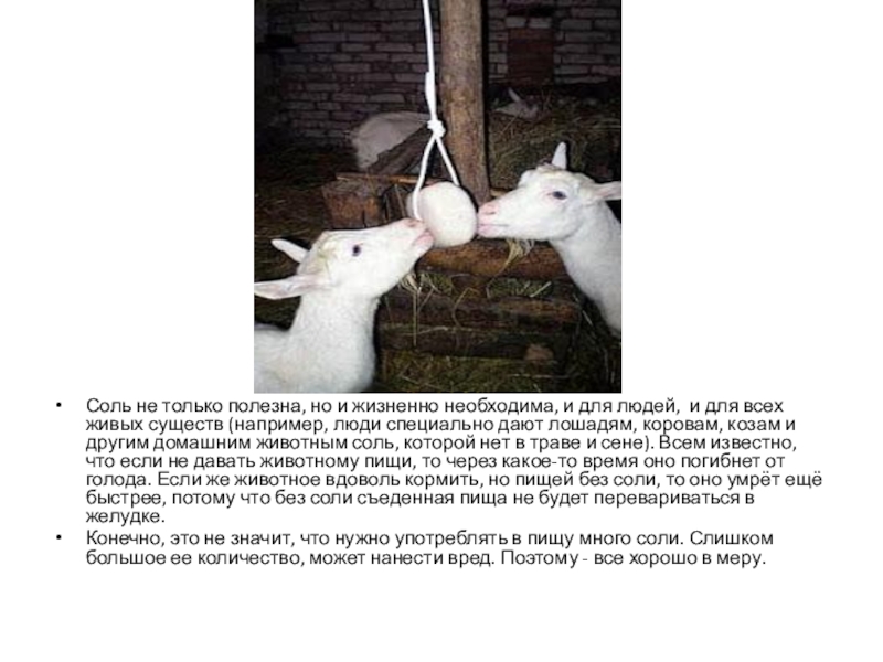и для всех живых существ (например, люди специально дают лошадям, коровам, козам и другим домашним животным соль, которой нет в траве и сене). Всем известно, что если не давать животному пищи, то через какое-то время оно погибнет от голода. Если же животное вдоволь кормить, но пищей без соли, то оно умрёт ещё быстрее, потому что без соли съеденная пища не будет перевариваться в желудке.