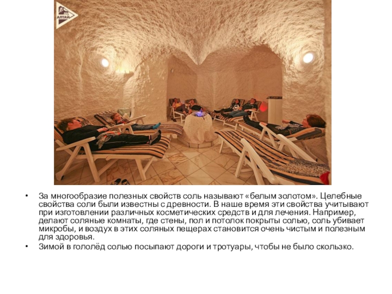 были известны с древности. В наше время эти свойства учитывают при изготовлении различных косметических средств и для лечения. Например, делают соляные комнаты, где стены, пол и потолок покрыты солью, соль убивает микробы, и воздух в этих соляных пещерах становится очень чистым и полезным для здоровья.