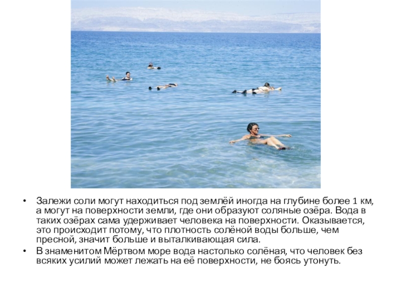 км, а могут на поверхности земли, где они образуют соляные озёра. Вода в таких озёрах сама удерживает человека на поверхности. Оказывается, это происходит потому, что плотность солёной воды больше, чем пресной, значит больше и выталкивающая сила.