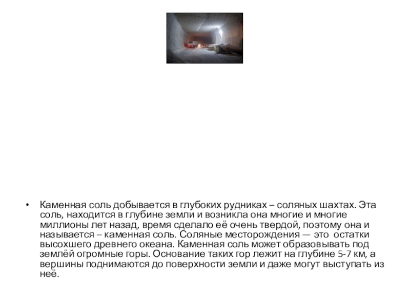Слайд 12Каменная соль добывается в глубоких рудниках – соляных шахтах. Эта соль,