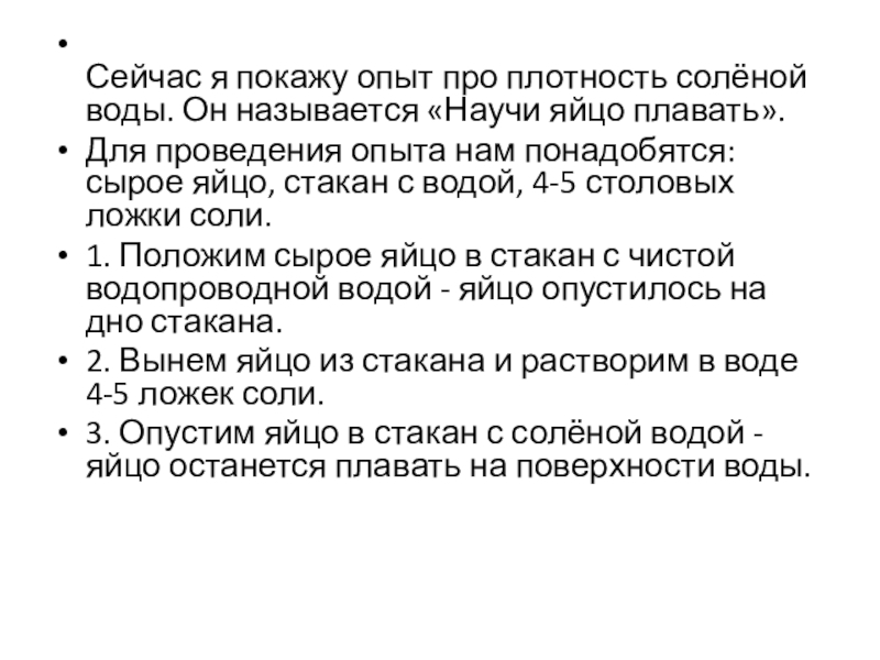 Сейчас я покажу опыт про плотность солёной воды. Он называется «Научи