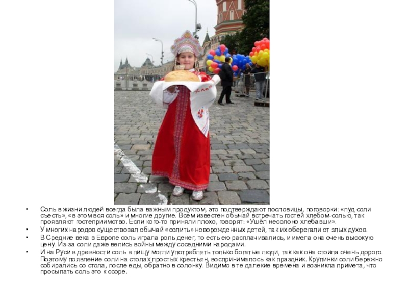 поговорки: «пуд соли съесть», «в этом вся соль» и многие другие. Всем известен обычай встречать гостей хлебом-солью, так проявляют гостеприимство. Если кого-то приняли плохо, говорят: «Ушёл несолоно хлебавши».