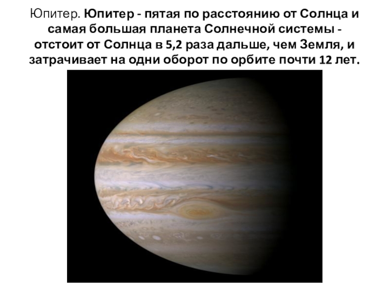 Слайд 21Юпитер. Юпитер - пятая по расстоянию от Солнца и самая большая