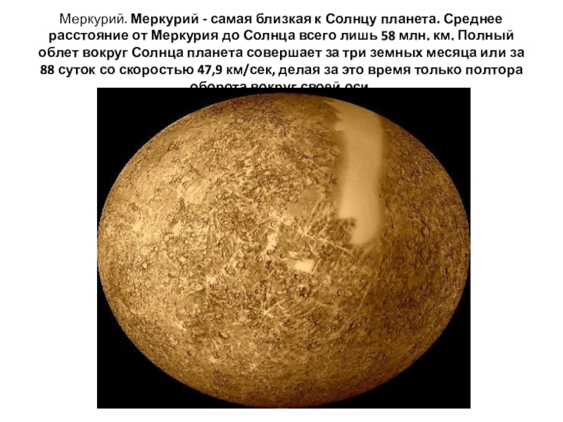 Слайд 18Меркурий. Меркурий - самая близкая к Солнцу планета. Среднее расстояние от