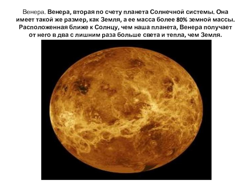 же размер, как Земля, а ее масса более 80% земной массы. Расположенная ближе к Солнцу, чем наша планета, Венера получает от него в два с лишним раза больше света и тепла, чем Земля.