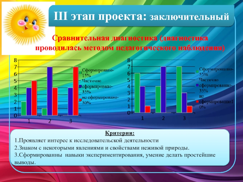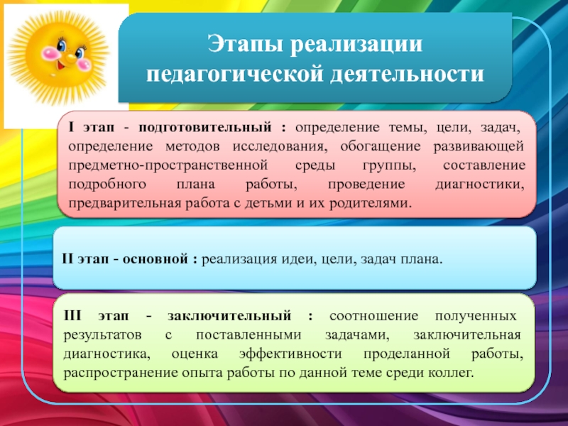 III этап - заключительный : соотношение полученных результатов с поставленными задачами, заключительная диагностика, оценка эффективности проделанной работы, распространение опыта работы по данной теме среди коллег.