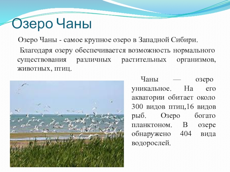 Чаны — озеро уникальное. На его акватории обитает около 300 видов птиц,16 видов рыб. Озеро богато планктоном. В озере обнаружено 404 вида водорослей.