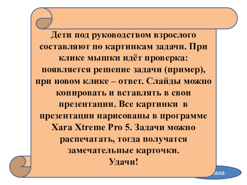 клике мышки идёт проверка: появляется решение задачи (пример), при новом клике – ответ. Слайды можно копировать и вставлять в свои презентации. Все картинки в презентации нарисованы в программе Xara Xtreme Pro 5. Задачи можно распечатать, тогда получатся замечательные карточки.