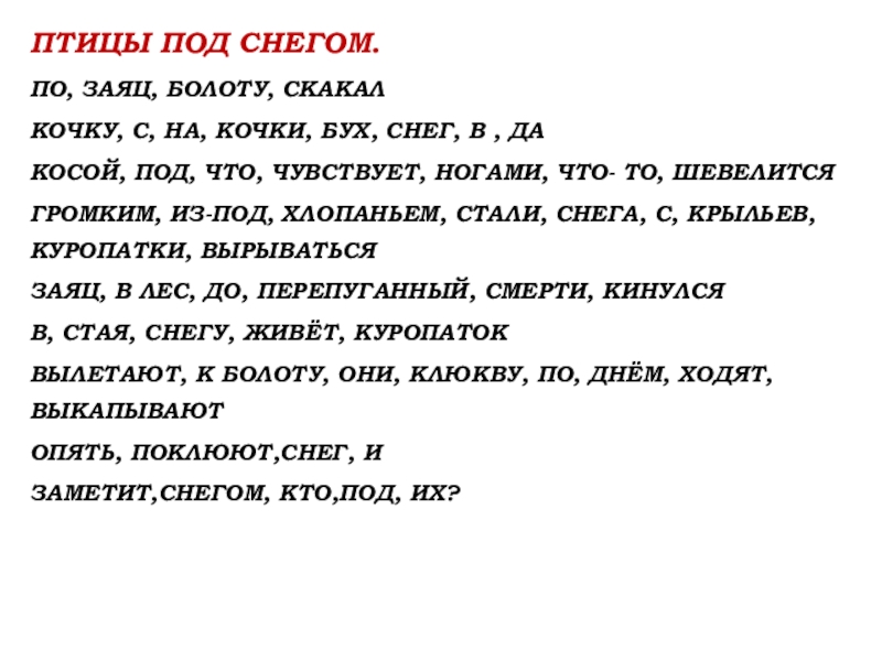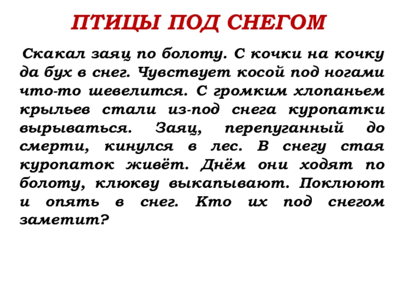 ПТИЦЫ ПОД СНЕГОМ.ПО, ЗАЯЦ, БОЛОТУ, СКАКАЛКОЧКУ, С, НА, КОЧКИ, БУХ, СНЕГ, В , ДАКОСОЙ, ПОД, ЧТО, ЧУВСТВУЕТ, НОГАМИ, ЧТО- ТО, ШЕВЕЛИТСЯГРОМКИМ, ИЗ-ПОД, ХЛОПАНЬЕМ, СТАЛИ, СНЕГА, С, КРЫЛЬЕВ, КУРОПАТКИ, ВЫРЫВАТЬСЯЗАЯЦ, В ЛЕС, ДО, ПЕРЕПУГАННЫЙ, СМЕРТИ, КИНУЛСЯВ, СТАЯ,
