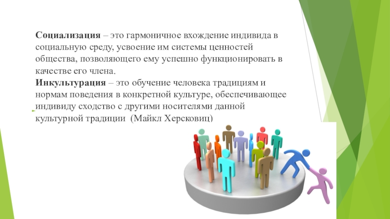 Инкультурация – это обучение человека традициям и нормам поведения в конкретной культуре, обеспечивающее индивиду сходство с другими носителями данной культурной традиции (Майкл Херсковиц)