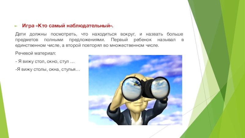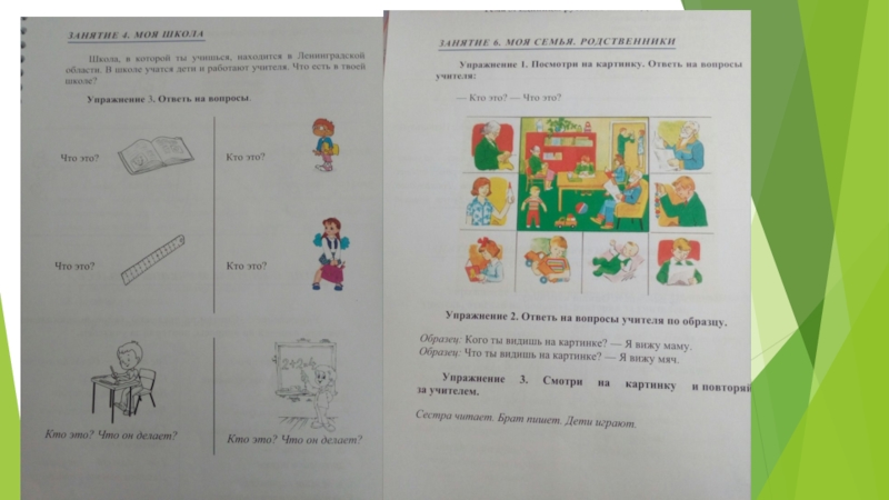 больше предметов полными предложениями. Первый ребенок называл в единственном числе, а второй повторял во множественном числе.