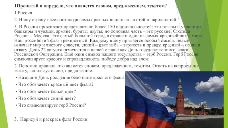 3. В России проживают представители более 150 национальностей: это татары и украинцы, башкиры и чуваши, армяне, буряты, якуты, но основная часть – это русские. Столица России – Москва. Это самый большой город в стране и один из самых красивейших в мире. Наш российский флаг трёхцветный. Каждому цвету придается особый смысл. Белый означает мир и чистоту совести, синий – цвет неба – верность и правду, красный – огонь и отвагу. День 22 августа отмечается в нашей стране как День государственного флага Российской Федерации. Ещё один символ нашего государства – герб России. Герб России символизирует красоту и справедливость, победу добра над злом.