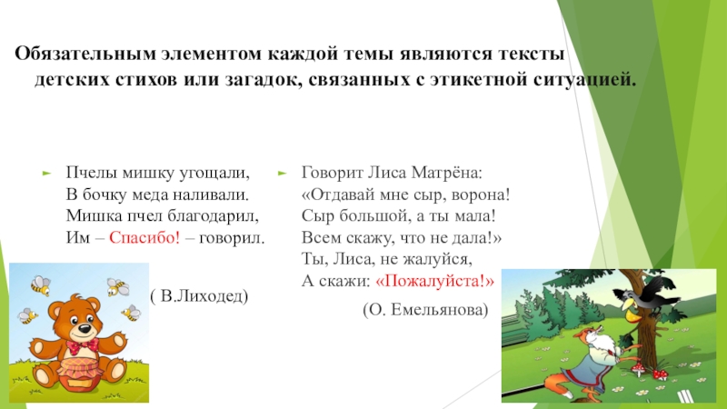 Слайд 26Обязательным элементом каждой темы являются тексты детских стихов или загадок, связанных