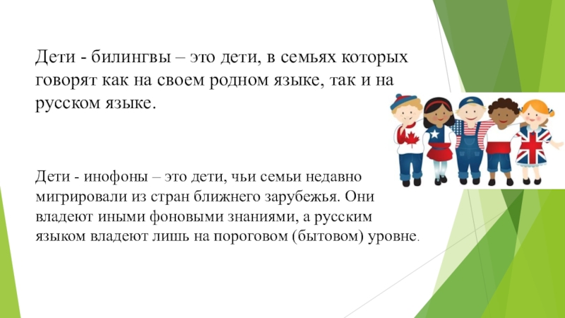 Дети - инофоны – это дети, чьи семьи недавно мигрировали из стран ближнего зарубежья. Они владеют иными фоновыми знаниями, а русским языком владеют лишь на пороговом (бытовом) уровне.