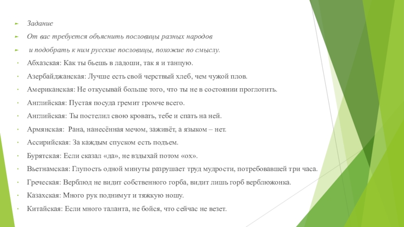 Греческая: Верблюд не видит собственного горба, видит лишь горб верблюжонка.