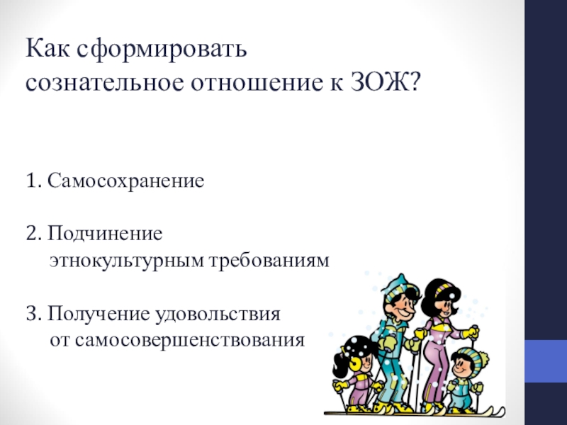 Как сформировать  сознательное отношение к ЗОЖ?   1. Самосохранение  2. Подчинение