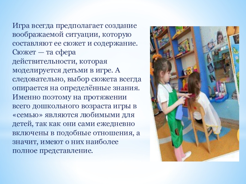 содержание. Сюжет — та сфера действительности, которая моделируется детьми в игре. А следовательно, выбор сюжета всегда опирается на определённые знания. Именно поэтому на протяжении всего дошкольного возраста игры в «семью» являются любимыми для детей, так как они сами ежедневно включены в подобные отношения, а значит, имеют о них наиболее полное представление.