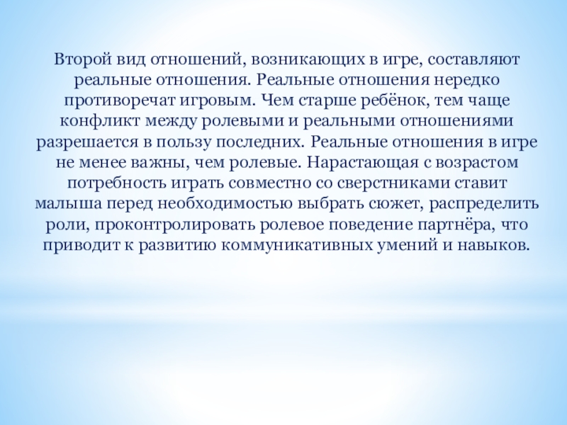 нередко противоречат игровым. Чем старше ребёнок, тем чаще конфликт между ролевыми и реальными отношениями разрешается в пользу последних. Реальные отношения в игре не менее важны, чем ролевые. Нарастающая с возрастом потребность играть совместно со сверстниками ставит малыша перед необходимостью выбрать сюжет, распределить роли, проконтролировать ролевое поведение партнёра, что приводит к развитию коммуникативных умений и навыков.