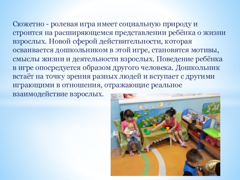 представлении ребёнка о жизни взрослых. Новой сферой действительности, которая осваивается дошкольником в этой игре, становятся мотивы, смыслы жизни и деятельности взрослых. Поведение ребёнка в игре опосредуется образом другого человека. Дошкольник встаёт на точку зрения разных людей и вступает с другими играющими в отношения, отражающие реальное взаимодействие взрослых.