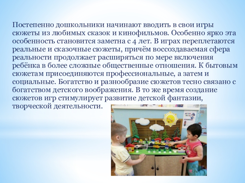 и кинофильмов. Особенно ярко эта особенность становится заметна с 4 лет. В играх переплетаются реальные и сказочные сюжеты, причём воссоздаваемая сфера реальности продолжает расширяться по мере включения ребёнка в более сложные общественные отношения. К бытовым сюжетам присоединяются профессиональные, а затем и социальные. Богатство и разнообразие сюжетов тесно связано с богатством детского воображения. В то же время создание сюжетов игр стимулирует развитие детской фантазии, творческой деятельности.