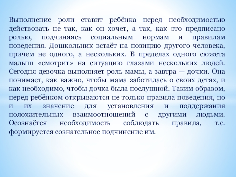 хочет, а так, как это предписано ролью, подчиняясь социальным нормам и правилам поведения. Дошкольник встаёт на позицию другого человека, причем не одного, а нескольких. В пределах одного сюжета малыш «смотрит» на ситуацию глазами нескольких людей. Сегодня девочка выполняет роль мамы, а завтра — дочки. Она понимает, как важно, чтобы мама заботилась о своих детях, и как необходимо, чтобы дочка была послушной. Таким образом, перед ребёнком открываются не только правила поведения, но и их значение для установления и поддержания положительных взаимоотношений с другими людьми. Осознаётся необходимость соблюдать правила, т.е. формируется сознательное подчинение им.