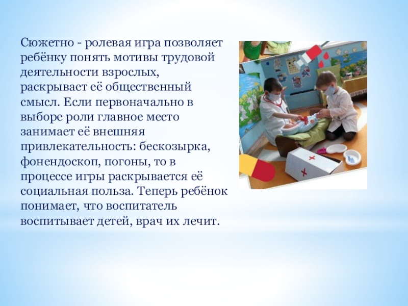 Слайд 6Сюжетно - ролевая игра позволяет ребёнку понять мотивы трудовой деятельности взрослых,
