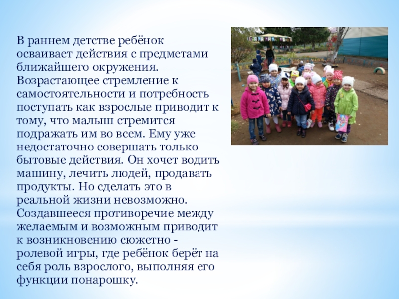 Слайд 2В раннем детстве ребёнок осваивает действия с предметами ближайшего окружения. Возрастающее