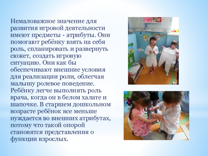 помогают ребёнку взять на себя роль, спланировать и развернуть сюжет, создать игровую ситуацию. Они как бы обеспечивают внешние условия для реализации роли, облегчая малышу ролевое поведение. Ребёнку легче выполнять роль врача, когда он в белом халате и шапочке. В старшем дошкольном возрасте ребёнок все меньше нуждается во внешних атрибутах, потому что такой опорой становятся представления о функции взрослых.