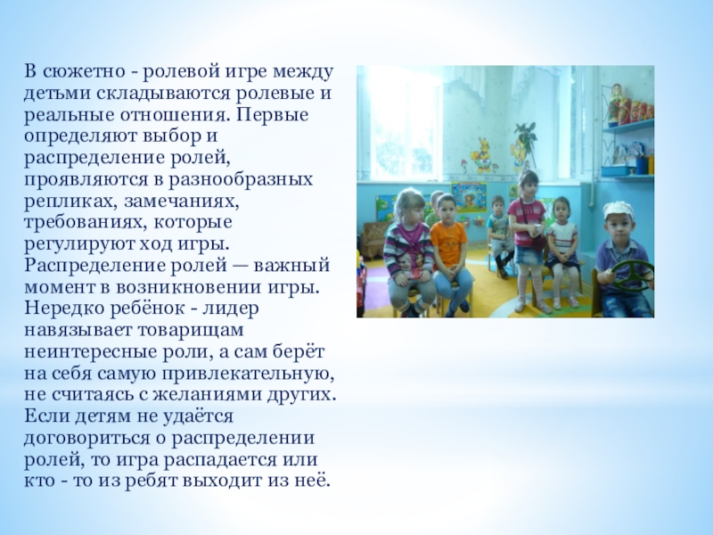 отношения. Первые определяют выбор и распределение ролей, проявляются в разнообразных репликах, замечаниях, требованиях, которые регулируют ход игры. Распределение ролей — важный момент в возникновении игры. Нередко ребёнок - лидер навязывает товарищам неинтересные роли, а сам берёт на себя самую привлекательную, не считаясь с желаниями других. Если детям не удаётся договориться о распределении ролей, то игра распадается или кто - то из ребят выходит из неё.