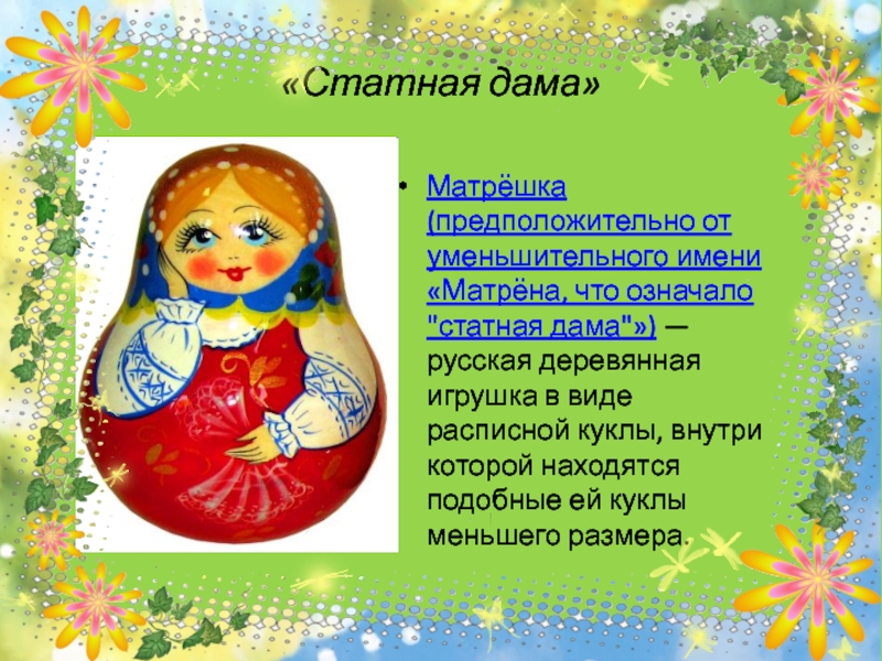Матрёшка (предположительно от уменьшительного имени «Матрёна, что означало "статная дама"»)