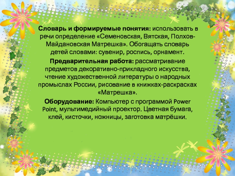 Оборудование: Компьютер с программой Power Point, мультимедийный проектор. Цветная бумага, клей, кисточки, ножницы, заготовка матрёшки.