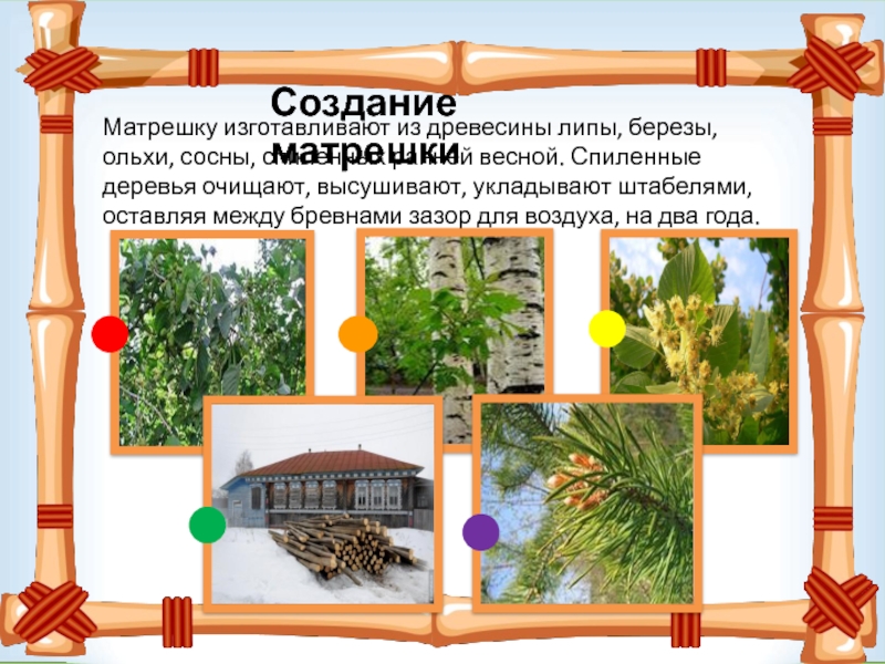Матрешку изготавливают из древесины липы, березы, ольхи, сосны, спиленных ранней
