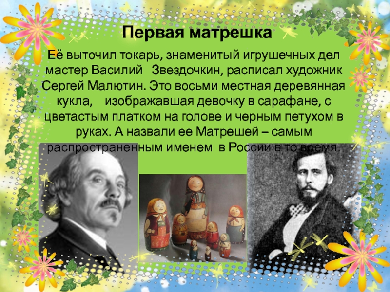 расписал художник Сергей Малютин. Это восьми местная деревянная кукла, изображавшая девочку в сарафане, с цветастым платком на голове и черным петухом в руках. А назвали ее Матрешей – самым распространенным именем в России в то время.