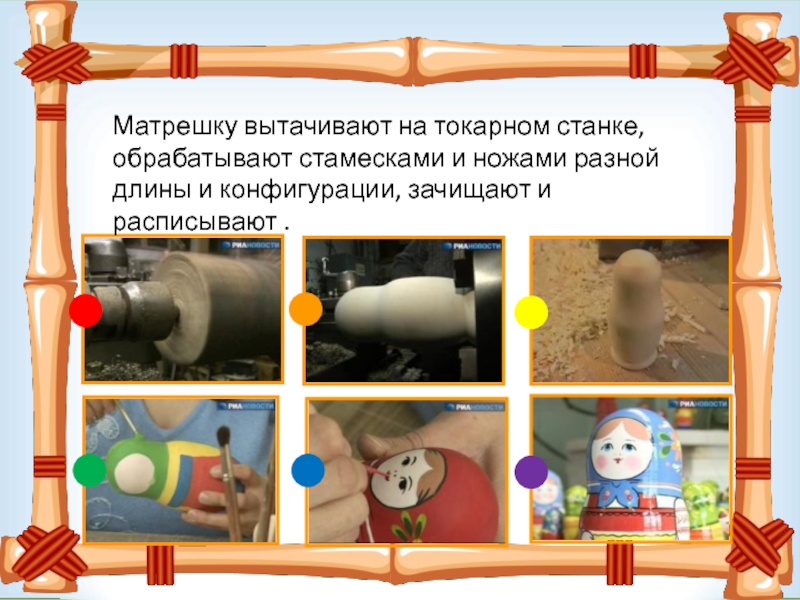 Слайд 13Матрешку вытачивают на токарном станке, обрабатывают стамесками и ножами разной длины