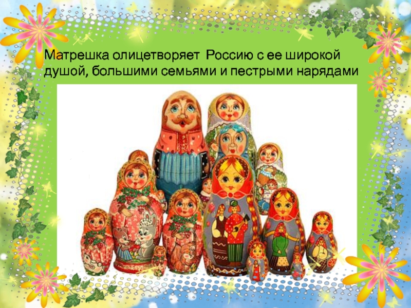 Слайд 15Матрешка олицетворяет Россию с ее широкой душой, большими семьями и пестрыми