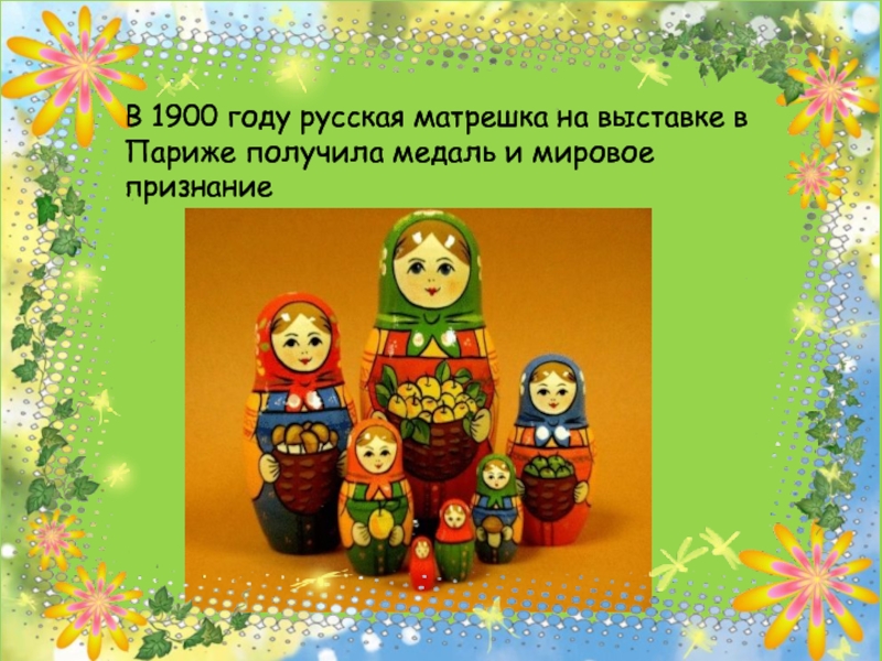 Слайд 28В 1900 году русская матрешка на выставке в Париже получила медаль